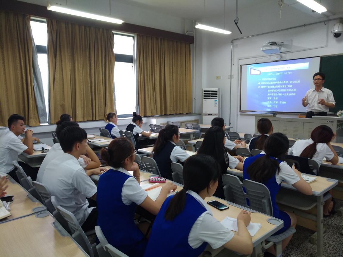 5月17日 塘栖雷迪森运河庄园酒店的总经理池海平先生为学生们传授了“特色文化主题酒店的实践与探索”在其酒店的做法,他告诫建议学生从基层做起,坚持在一个企业做几年,打下扎实的基础。