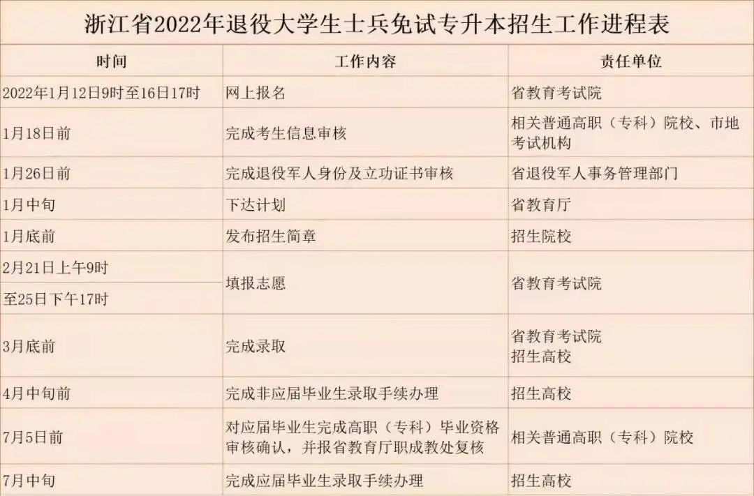 (二)资格审核。2022 年 1 月 18 日前,相关高职(专科)院校负责对完成网上信息输入的本校学生进行网上资格审核;各设区市教育考试机构负责对完成网上信息输入的非应届毕业生进行网上资格审核。2022 年 1 月 26 日前,浙江省退役军人事务管理部门完成退役军人身份和立功证书审核。