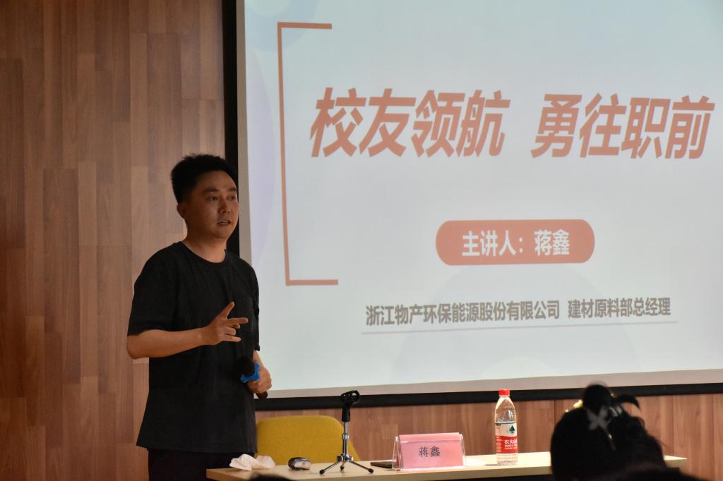 蒋鑫,在校时为分院团总支副书记,曾获浙江省高校优秀毕业生、校级三好学生等荣誉。毕业后,曾担任浙江物产环保能源股份有限公司销售六部业务主管,销售六部总经理助理等职务,现任公司建材原料部总经理。此次讲座,蒋鑫校友就“大学生的职业能力提升、就业形势和就业定位”为主题,与学生干部进行了热烈的互动和深入的交流。