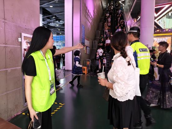 本届动漫节以“国漫正当时”为主题,首次重磅推出“动漫+科技”主题展区,集中展示了《黑神话:悟空》1:1震撼半身像、前沿外骨骼机器人等创新成果。智慧旅游学院的协管员团队活跃在主会场六大展区,承担着展商协调对接、观众引导咨询、活动流程执行等核心任务。