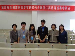 2013年4月26日,由浙江省大学外语教学研究会高职高专分会组织的第四届全国高职高专英语写作大赛在浙江横店影视职业学院进行,我校选派了3名学生分别参加了专业组及非专业组的比赛。在比赛中选手发挥稳定,不负众望,满载而归。华肖文、吴鑫同学分获得了非专业组二等奖和三等奖的好成绩;蔡学明同学获得了专业组三等奖的好成绩。