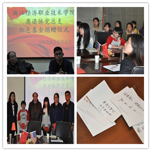 2014年4月3日1点30分,为弘扬红色精神,传递爱心正能量,我校文化艺术学院党总支在英语村会议室成功举办离退休党总支红色基金捐赠仪式。本次活动有幸邀请到我校离退休党总支王根海书记,出席本次会议的还有文化艺术学院党总支书记潘军老师和辅导员余晓矾老师。