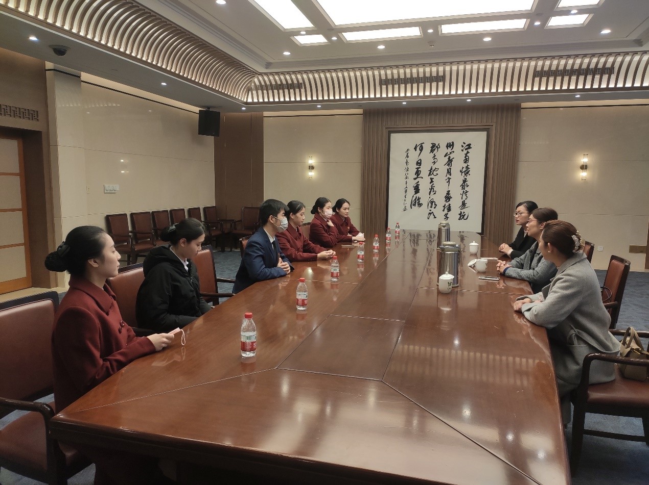 在省人民大会堂,老师们与2018级空乘专业校友进行了深入的座谈交流,了解了校友们的工作和生活情况,并对校友们在各自岗位上取得的优异成绩表示祝贺。通过一年的历练,陈奕宇现已担任人民大会堂礼宾部工会组长,多次独立完成部门的活动组织与策划;陈佳乐通过层层面试、严格筛选,被派遣到省政府3号楼担任省委常委的专属服务人员;林园园在同批转正的员工中率先成为带班师傅,已经开始单独带徒弟。聊起学校,他们表示虽已毕业,但对母校依旧怀着深厚情感,深切感恩学校对他们的培养,表示一定会珍惜机会努力工作,不负师长的殷切期望和学校的积极培养。座谈交流中,校友们也对目前实习的学弟学妹提出期望,和他们分享工作经验并进行现场指导,发挥校友导师的作用。