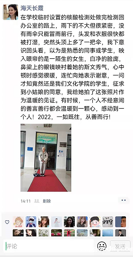 2022年1月5日下午,文化艺术学院海霞老师在从核酸检测处返回办公室的途中突遇小雨,雨不大,但很密集。老师未带雨伞,短短几分钟,雨水打湿了她的头发和衣服。冒雨前行时,有人从身后为她撑起一把伞,海霞老师原以为撑伞的是熟悉的同事或学生,转身发现一位陌生的女同学。交流询问得知她是文化艺术学院P111120文管班的倪淑婕。海霞老师感触颇深,随后就此事发了朋友圈,并很快联系了其班主任吕云老师,要求表扬该生以示鼓励。