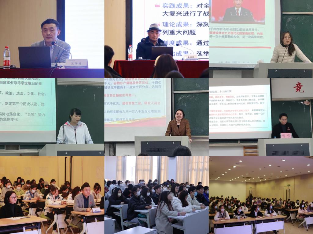 学院邀请学校党委委员、纪委书记朱利萍为学院师生上党课(形势政策课),与大家深入交流了认识和体会,勉励青年师生坚定不移听党话、跟党走,怀抱梦想又脚踏实地,敢想敢为又善作善成,立志做有理想、敢担当、能吃苦、肯奋斗的新时代好青年。学院党总支把学习宣传贯彻党的二十大精神作为当前和今后一项首要政治任务、长期战略任务,紧密结合省委“六学六进六争先”学习实践活动,着力在“学懂弄通做实”上下功夫,迅速行动,精心组织,集中开展“六学三讲二研一营造”学习宣讲活动,推动学习宣传贯彻党的二十大精神深入持久开展。“六学”:领导干部专题学、党员干部示范学、骨干教师集中学、线下线上全员学、青年师生创新学、追随足迹现场学;“三讲”:领导干部带头讲、支部书记融合讲、青年师生现场讲;“二研”:理论研究、宣介研讨。宣讲团队结合党的二十大会议精神和青年责任担当,主动思考、主动发声,开展了主题为《以中国式现代化推进中华民族伟大复兴》的党课宣讲。总支、支部书记面向全体党员、全体学生讲党课,“三联系”教师深入班级讲党课,开展班级班会、团日活动学习党课,做到“班班有覆盖”。