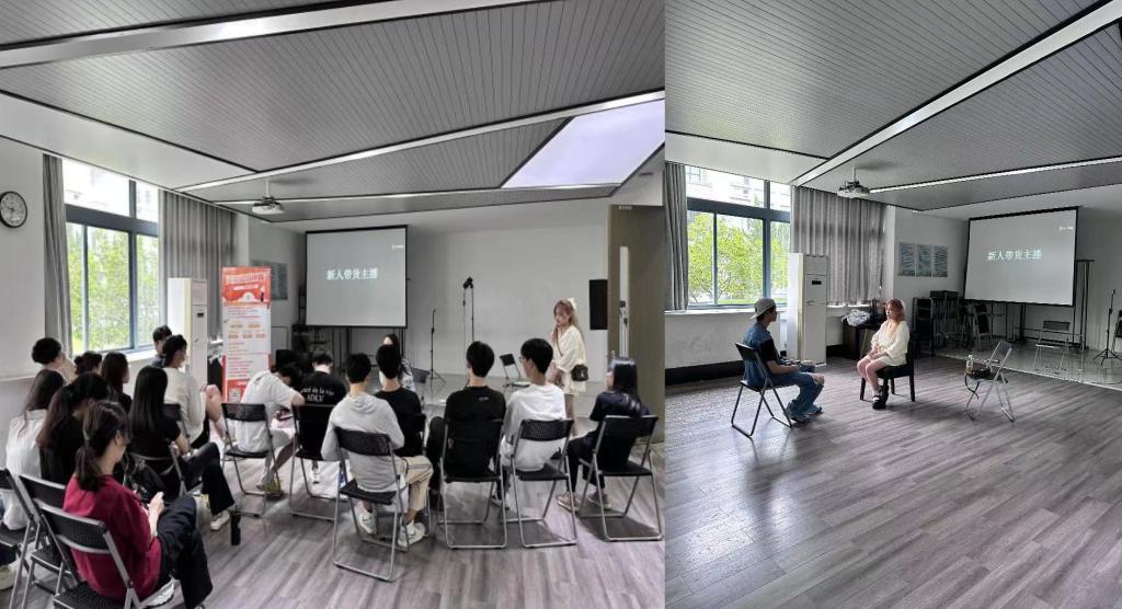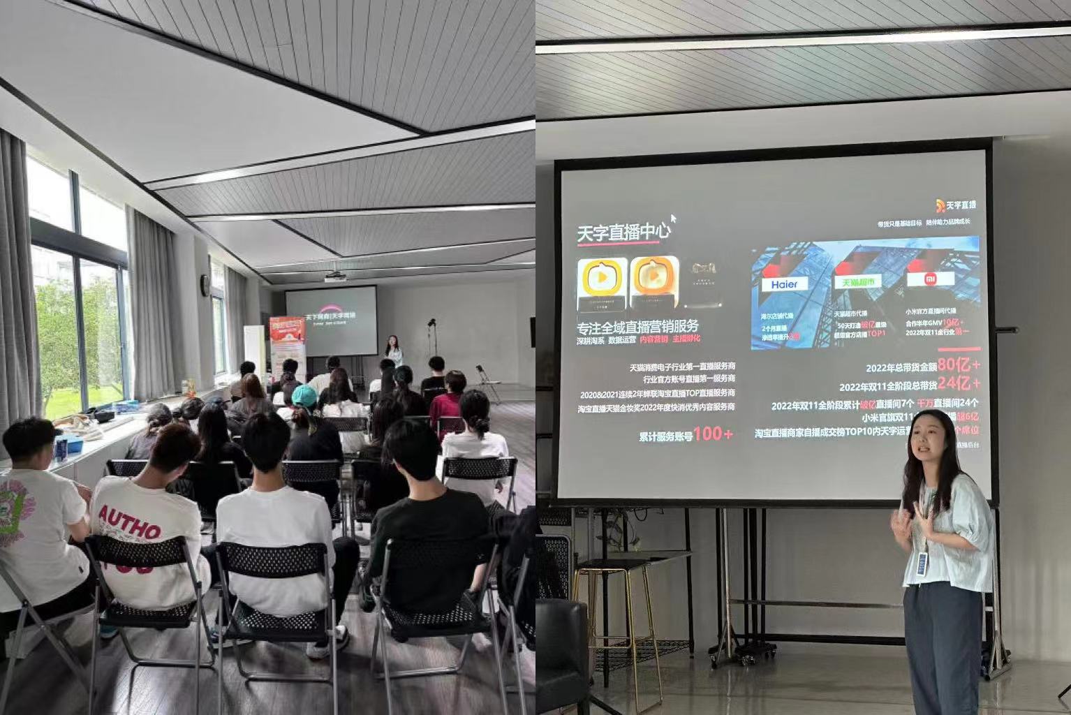 5月30日上午,浙江天下网商网络传媒有限公司天字网络人事负责人龙风、 人事王霞、主播经纪王君怡一行来我院表演艺术专业进班宣讲。天下网商是由浙江出版联合集团与阿里巴巴集团携手打造的专业互联网新商业平台,曾被评为天猫消费电子行业第一直播服务商、行业官方账号直播第一服务商、2020&2021连续2年蝉联淘宝直播TOP直播服务商、淘宝直播天猫金妆奖2022年度快消优秀内容服务商。