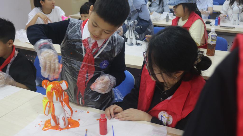 在同学们的指导下,小朋友们很快进入创作模式。他们发挥想象力,大胆将各种颜料混合调色,拿起画笔尽情挥洒。原本单调的流体熊在他们的手中变得五彩斑斓、别具一格。