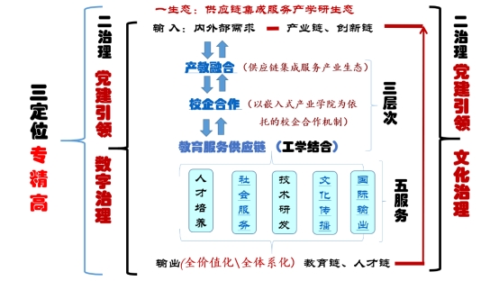 1.“33521”个性化集成式教育服务模式:精准“三定位”(专、精、高)、贯通“三层次”(产教融合、校企合作、工学结合)、强化“五服务”(人才培养、技术研发、社会服务、文化传播、国际输出)、优化“两治理”(党建引领下的数字治理和文化治理)、融入“一生态”(供应链集成服务产学研共生生态)。