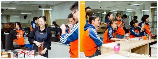 会后,校友们走出教室来到咖啡实训室,正值有几位学弟学妹在为国际交流赛和省赛做赛前训练,校友们兴致勃勃地向学弟学妹们请教咖啡制作方法,并羡慕地表示,学校为同学们提供了优越学习环境,希望学弟学妹们要珍惜。