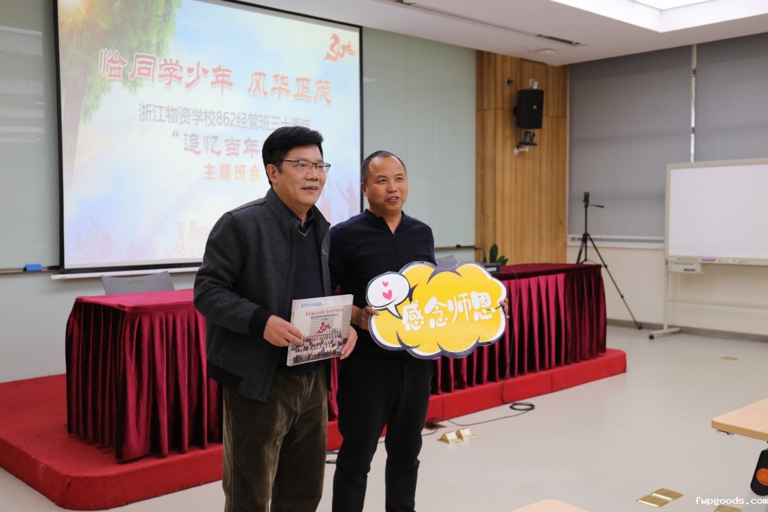 浙江物产元通汽车集团有限公司党委副书记、副董事长池婉芬,浙江莓蓝芳农业开发有限公司董事长潘卫东向班主任赠送班级纪念册。两位班主任结合各自的工作经历,表达了对校友们深深的思念与祝福。