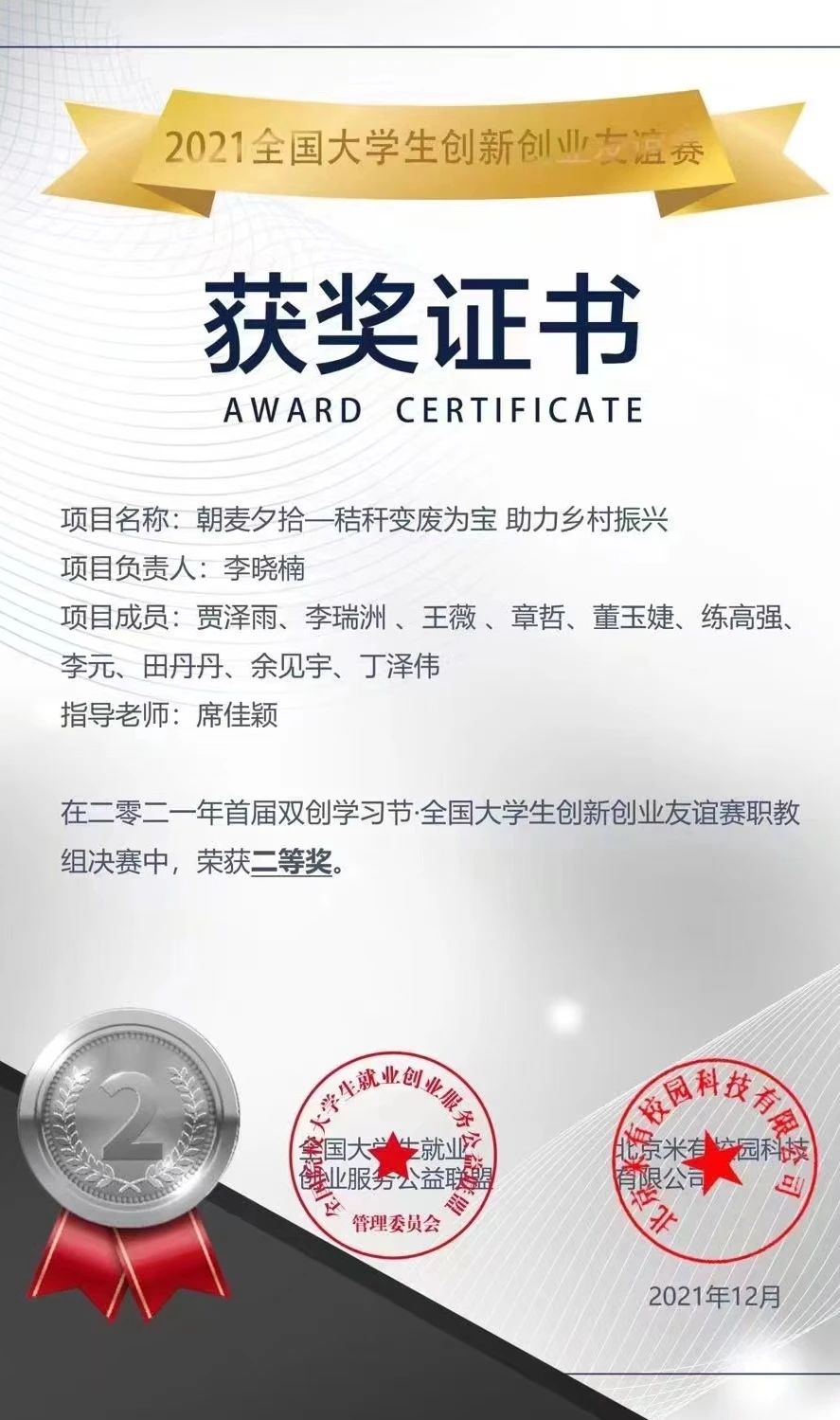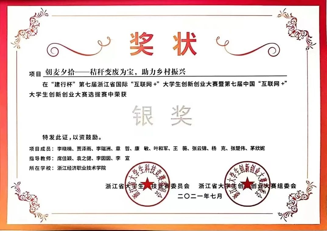 在充分考察调研相关情况的基础上,注册成立临海市嘉楠信息技术有限公司,创立“秸小楠”自主品牌,以秸秆餐具为主营业务,致力于秸秆环保制品的技术研发、推广、产品销售等。作为创业团队负责人,她带领团队遍浙江省、安徽省、山东省等5市12区县46个村庄,回收原材料、寻求投资商和合作方,与海底捞等多家餐饮连锁企业达成合作,创收200多万元,带动帮助189户农户增收致富,相关事迹获得人民网、浙江日报等20多家主流媒体的报道。