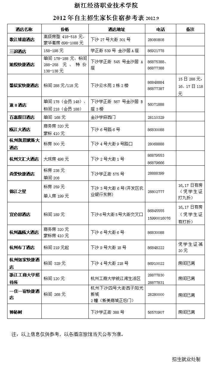 12、家长住宿参考表(点击图片查看大图):表中内容仅供考生及家长参考,具体价格以酒店公布为准。