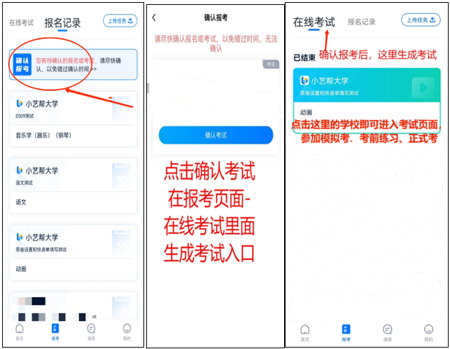 如果确认报考页面显示无数据,请耐心等待学校导入考试,并持续关注确认报考页面。若模拟考前一天还未看到数据或提示姓名、报考地区不匹配,请及时联系我校确认报考信息。如学校确认无误,请学生联系小艺帮客服处理。