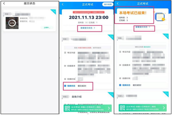上传后,可以在“查看提交状态”里看到视频上传进度。提交成功或考试时间结束后,考试状态显示已结束。