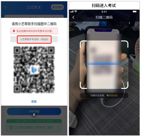 正式考试、模拟考试时,均可使用小艺帮助手APP扫描主机位(小艺帮APP)考试科目介绍页面下方的“小艺帮助手二维码”进入辅机位录制。