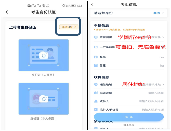 请认证考生身份证照片,按提示上传身份证人像面和国徽面,点击下一步,也可点击右上方手动上传身份证信息,填写身份证上的信息进行识别。