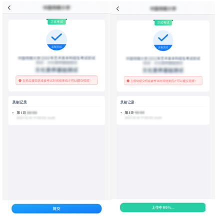 答题结束录制完毕后,主机视频系统会自动提交,请持续关注视频上传进度,确保考试视频上传完成。