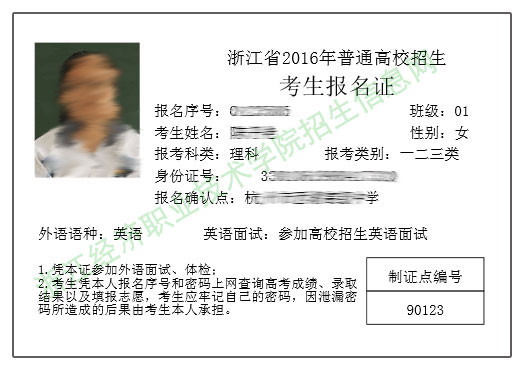 报名证可从浙江教育考试院网站(https://pgzy.zjzs.net:4431/login.htm)“报名证打印”下载,是一张比银行卡稍大的纸片,点我查看样稿。